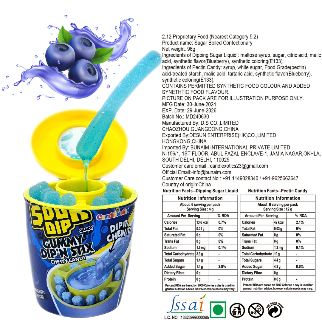 Sour Juicy Dip Gummy Candy Dip’N Stix Sweet & Sour Chewy Candy For Kids Blueberry Flavor, Perfect For Parties & Treats, 96 Grams